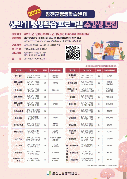 [¹Ìµð¾îÀü³² Á¦°¥´ëÁ¾ ±âÀÚ] °Áø±º Æò»ýÇнÀ¼¾ÅͰ¡ ¿À´Â 15ÀϱîÁö 2023³â »ó¹Ý±â Æò»ýÇнÀ ¼ö°»ýÀ» ¼±Âø¼ø ¸ðÁýÇÑ´Ù. °Áø±ºÀº Áö³ÇØ ±º¹ÎÀ» ´ë»óÀ¸·Î ¼ö¿äÁ¶»ç¿Í ¼³¹®Á¶»ç¸¦ °ÅÃÄ ¿ÃÇØ »ó¹Ý±â 26°³ ÇÁ·Î±×·¥À» °³¼³Çß´Ù. ÀÌÁß ¹Ù¸®¡¦