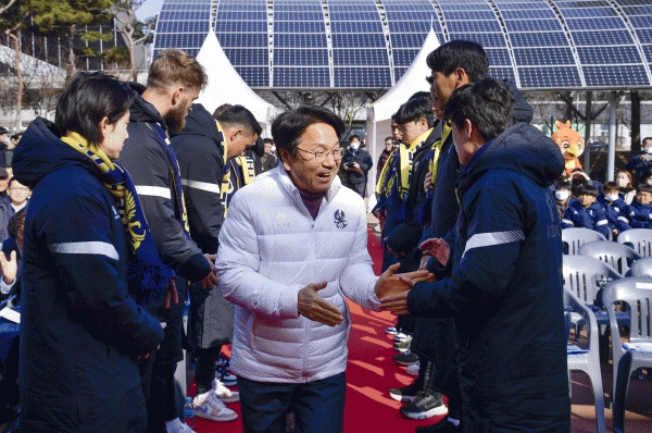 [¹Ìµð¾îÀü³² Á¦°¥´ëÁ¾ ±âÀÚ] ±¤ÁÖFC°¡ 3ÀÏ ±¤ÁÖÃ౸Àü¿ë±¸Àå¿¡¼ ¡®±¤ÁÖFC 2030 »õ·Î¿î ºñÀü¡¯À» ¼±Æ÷Çß´Ù. »õ ºñÀüÀº ¡®½Ã¹Î¿¡°Ô ¹ÏÀ½ÁÖ°í ÆÒµé¿¡°Ô »ç¶û¹Þ´Â ±¤ÁÖFC¡¯´Ù. ±¤ÁÖFC´Â »õ ºñÀü ´Þ¼ºÀ» À§ÇØ ÀÏ¿øÈµÈ Á¶Á÷ ü°è¿Í ¼º°ú Áß¡¦