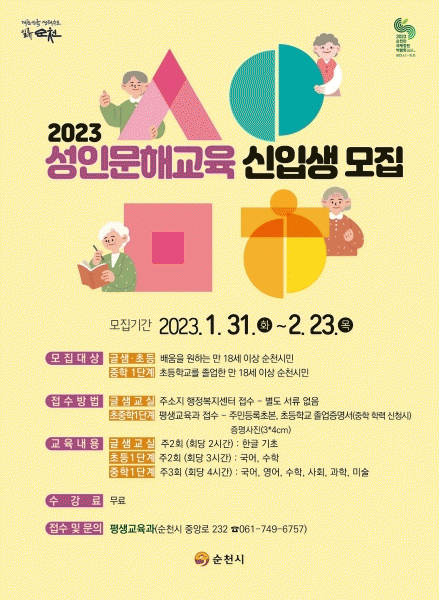 [¹Ìµð¾îÀü³² ÀÓ¼º¿Ï ±âÀÚ] ¼øÃµ½Ã´Â ¿À´Â 23ÀϱîÁö 2023³â ¼ºÀÎ ¹®ÇØ Çб³ ½ÅÀÔ»ýÀ» ¸ðÁýÇÑ´Ù. ¸ðÁý°úÁ¤Àº Ãʵî1´Ü°è¡¤ÁßÇÐ1´Ü°è, ±âÃÊÇѱ۱³½ÇÀÎ ±Û»ù±³½Ç ÃÑ 3°¡Áö °úÁ¤À¸·Î ¸ðµÎ ¹«·á·Î ¿î¿µµÈ´Ù. ÇзÂÀÎÁ¤°úÁ¤Àº Àǹ«±³À°À» ¹ÞÁö ¸ø¡¦