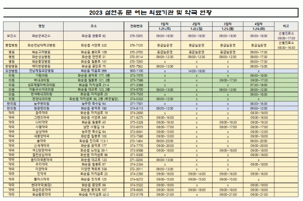 [¹Ìµð¾îÀü³² Á¦°¥´ëÁ¾ ±âÀÚ] ȼø±ºÀº ¼³ ¿¬ÈÞ ±â°£ÀÎ ¿À´Â 1¿ù21ÀϺÎÅÍ 1¿ù24ÀϱîÁö ±º¹ÎµéÀÌ °Ç°ÇÏ°í ¾ÈÀüÇÏ°Ô º¸³¾ ¼ö ÀÖµµ·Ï ÀÀ±ÞÁø·áü°è¸¦ ¿î¿µÇÑ´Ù°í ¹àÇû´Ù. Áö¿ª ÀÀ±ÞÀÇ·á¼¾ÅÍÀΠȼøÀü³²´ëÇб³º´¿øÀ» ºñ·ÔÇØ, º´¿ø 6°³¼Ò, ÀÇ¡¦