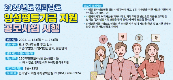 [¹Ìµð¾îÀü³² Á¦°¥´ëÁ¾ ±âÀÚ] Àü¶ó³²µµ´Â ¿À´Â 27ÀϱîÁö ¾ç¼ºÆòµî ¹®È È®»ê°ú ¿©¼ºÀÇ »çȸ Âü¿© È®´ë ¹× ±ÇÀÍ ÁõÁøÀ» À§ÇÑ ¡®¾ç¼ºÆòµî±â±Ý »ç¾÷¡¯À» °ø¸ðÇÑ´Ù°í ¹àÇû´Ù. °ø¸ð ºÐ¾ß´Â ¾ç¼ºÆòµî ¹®È È®»ê, ÀÏ¡¤°¡Á¤ ¾ç¸³Áö¿ø, ¿©¼º ¿ª·® ¡¦