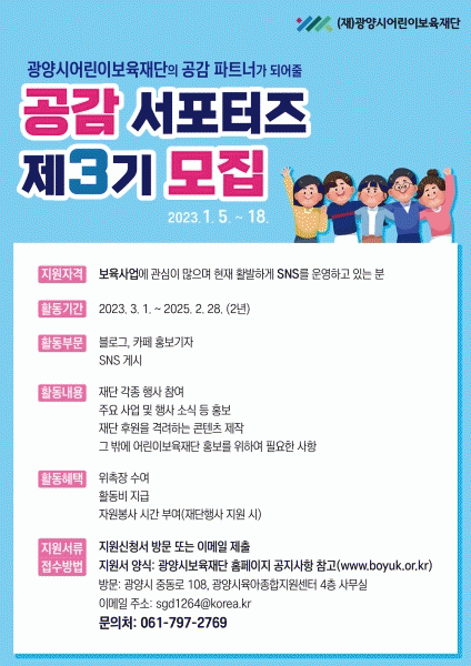 [¹Ìµð¾îÀü³² ÀÓ¼º¿Ï ±âÀÚ] ±¤¾ç½Ã¾î¸°À̺¸À°Àç´ÜÀº Àç´Ü°ú ½Ã¹ÎÀÇ ¾ç¹æÇâ ¼ÒÅëÀ» °ÈÇϰíÀÚ ¿À´Â 1¿ù 18ÀϱîÁö ¡®Á¦3±â °ø°¨¼Æ÷ÅÍÁ¸¦ ¸ðÁýÇÑ´Ù. ¸ðÁýÀοøÀº Ȱ¹ßÇÏ°Ô È°µ¿ÇÒ ¼Ò¼öÁ¤¿¹ 10¸íÀ¸·Î º¸À°»ç¾÷¿¡ ´ëÇÑ ÀÌÇØ¿Í °ü½ÉÀÌ ³ô°í¡¦