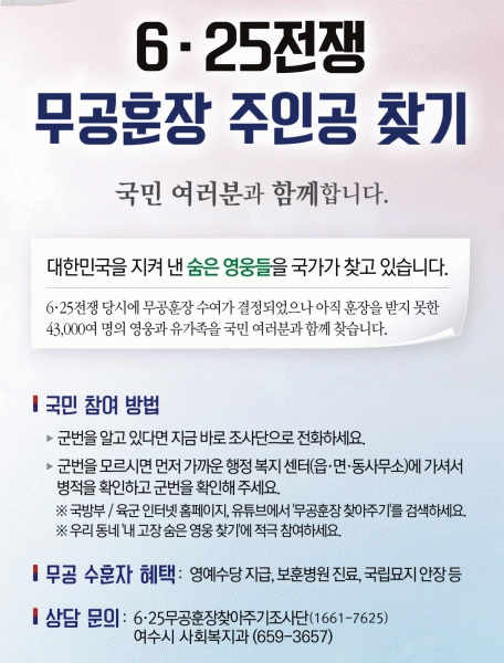 [¹Ìµð¾îÀü³² ÀüÇü¼º ±âÀÚ] ¿©¼ö½Ã°¡ ±¹¹æºÎ¿Í ÇÔ²² ¡®6¡¤25ÂüÀüÀ¯°øÀÚ ¹«°øÈÆÀå ã¾Æ Áֱ⡯ Ä·ÆäÀÎÀ» ½Ç½ÃÇÑ´Ù. À̹ø Ä·ÆäÀÎÀº 6¡¤25ÀüÀï ´ç½Ã ÈÆÀå ¼ö¿©°¡ °áÁ¤µÆÀ¸³ª, ¾ÆÁ÷ ÈÆÀåÀ» ¹ÞÁö ¸øÇÑ ¹«°ø¼öÈÆÀÚ ¶Ç´Â À¯°¡Á·À» ã¾Æ ÈÆÀåÀ» Àü¡¦