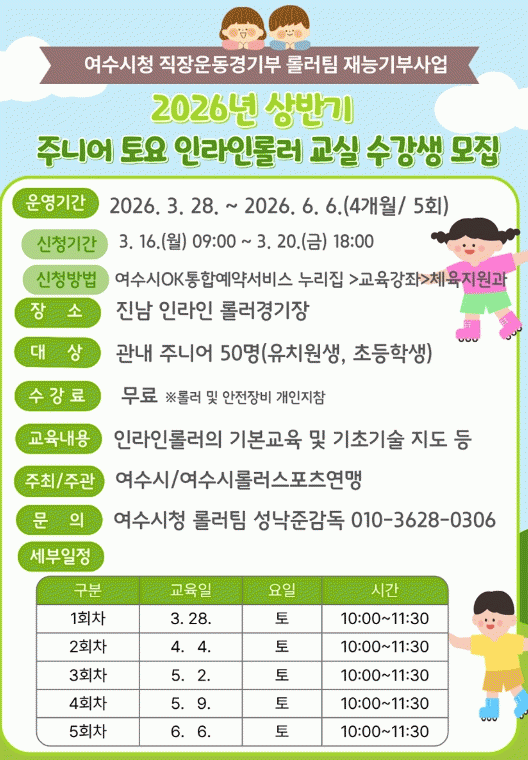 [¹Ìµð¾îÀü³² ÀüÇü¼º ±âÀÚ]¿©¼ö½Ã°¡ Áö¿ª À¯¼Ò³âÀ» ´ë»óÀ¸·Î ¡®2026³â »ó¹Ý±â ÁִϾî Åä¿ä ÀζóÀηѷ¯ ±³½Ç¡¯À» ¿î¿µÇÏ°í ¿À´Â 3¿ù 16ÀϺÎÅÍ 20ÀϱîÁö ¼ö°»ýÀ» ¼±Âø¼ø ¸ðÁýÇÑ´Ù. À̹ø ÇÁ·Î±×·¥Àº °ü³» À¯Ä¡¿ø»ý°ú ÃʵîÇлý 50¸íÀ» ´ë»óÀ¸¡¦