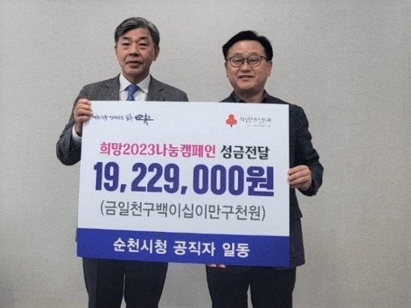 [¹Ìµð¾îÀü³² ÀÓ¼º¿Ï ±âÀÚ] ¼øÃµ½Ã´Â Áö³ 27ÀÏ ½Ãû ¼Ò¼Ó °øÁ÷ÀÚµéÀÌ Èñ¸Á2023³ª´®Ä·ÆäÀο¡ Àû±Ø µ¿ÂüÇØ 1922¸¸¿øÀ» ±âºÎÇß´Ù°í ¹àÇû´Ù. ¼º±ÝÀº ¼ÕÁ¡½Ä ¼øÃµ½Ã ºÎ½ÃÀåÀÌ ¿©¼öMBC ¹æ¼Û±¹À» ¹æ¹®ÇØ Á÷Á¢ ±âŹÇßÀ¸¸ç Àü³²»çȸº¹Áö°øµ¿¸ð±Ýȸ¡¦
