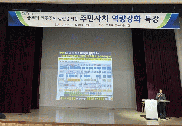 [¹Ìµð¾îÀü³² Á¦°¥´ëÁ¾ ±âÀÚ] ±¸·Ê±ºÀº Áö³ 12ÀÏ ¹®È¿¹¼úȸ°ü¿¡¼ ÁÖ¹ÎÀÚÄ¡À§¿øÈ¸ À§¿ø µî 100¿©¸íÀÌ Âü¼®ÇÑ °¡¿îµ¥ ÁÖ¹ÎÀÚÄ¡ ¿ª·® °È Ư°À» °³ÃÖÇß´Ù. À̹ø Ư°Àº ¸¶À» ÀÚÄ¡ Àü¹®°¡·Î Àú¸íÇÑ ±¸ÀÚÀÎ ¹Ú»ç¸¦ ÃÊÃ»ÇØ¡®Áö¼Ó °¡´ÉÇÑ ¡¦