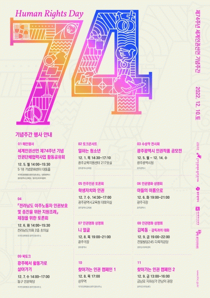 [¹Ìµð¾îÀü³² Á¦°¥´ëÁ¾ ±âÀÚ] ±¤ÁÖ±¤¿ª½Ã´Â ¼¼°èÀαǼ±¾ð 74ÁÖ³âÀ» ¸Â¾Æ 12¿ù1ÀϺÎÅÍ 14ÀϱîÁö ±¹°¡ÀαÇÀ§¿øÈ¸ ±¤ÁÖÀαǻ繫¼Ò, ½Ã±³À°Ã», ±¤ÁÖÆ®¶ó¿ì¸¶¼¾ÅÍ¿Í °øµ¿À¸·Î ±â³äÁÖ°£À» ¿î¿µÇÏ°í ´Ù¾çÇÑ ¹®ÈÇà»ç¸¦ ¿¬´Ù. ¸ÕÀú ±¤Áֽô 12¿ù¡¦