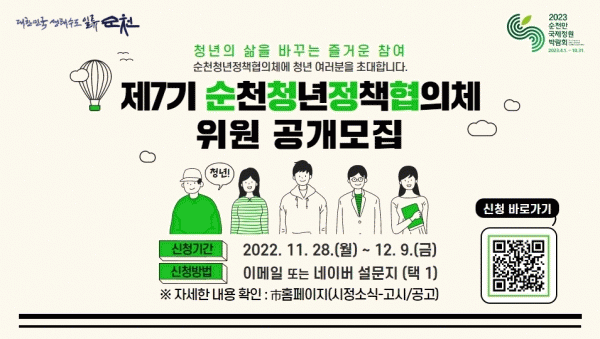 [¹Ìµð¾îÀü³² ÀÓ¼º¿Ï ±âÀÚ] ¼øÃµ½Ã°¡ û³âÀÌ ÇູÇÑ ÀÏ·ù û³âµµ½Ã¸¦ ¸¸µé±â À§ÇØ Ã»³âÀǰ߼ö·Å ¹× Á¤Ã¥Á¦¾È¿¡ Àû±ØÀûÀ¸·Î Âü¿©ÇÒ Á¦7±â ¼øÃµÃ»³âÁ¤Ã¥ÇùÀÇü À§¿øÀ» °ø°³ ¸ðÁýÇÑ´Ù. ¸ðÁýÀοøÀº 30¸í ³»¿Ü·Î ¿¬·Éº°, ¼ºº°, µµ½Ã¿Í ³óÃ̺°,¡¦