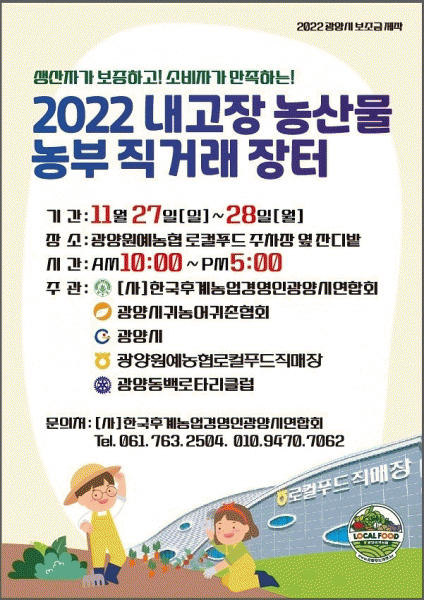 [¹Ìµð¾îÀü³² ÀÓ¼º¿Ï ±âÀÚ] ±¤¾ç½Ã´Â Çѱ¹³ó¾÷°æ¿µÀÎ ±¤¾ç½Ã¿¬ÇÕȸ, ±¤¾ç½Ã ±Í³ó¾î±ÍÃÌÇùȸ ÁÖÃÖ¡¤ÁÖ°üÀ¸·Î ¡®2022³â ³» °íÀå ³ó»ê¹° ³óºÎ Á÷°Å·¡ÀåÅÍ¡¯¸¦ ±¤¾ç¿ø¿¹³óÇù ·ÎÄÃǪµå ÁÖÂ÷Àå ¿· Àܵð¹ç¿¡¼ ¿À´Â 27~28ÀÏ ¿î¿µÇÑ´Ù. À̹ø Çà»ç¡¦
