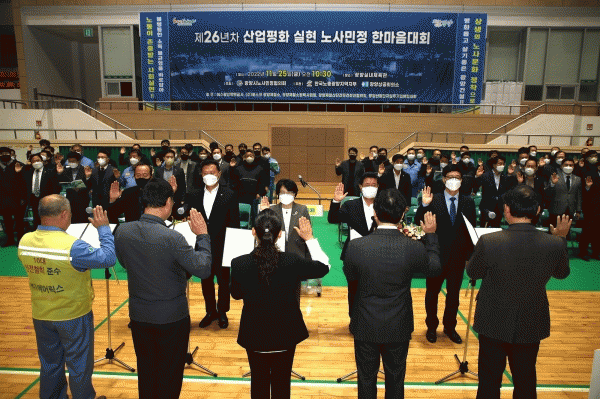 [¹Ìµð¾îÀü³² ÀÓ¼º¿Ï ±âÀÚ] ±¤¾ç½Ã´Â 11¿ù 25ÀÏ ±¤¾ç½Ç³»Ã¼À°°ü¿¡¼ ³ë»ç¹ÎÁ¤ °£ ÈÇÕÀ» ´ÙÁö°í Çù·Â°ü°è¸¦ ±¸ÃàÇϱâ À§ÇØ ±Ù·ÎÀÚ, ±â°ü ´ÜüÀå µî 700¿©¸íÀÌ Âü¼®ÇÑ °¡¿îµ¥ ¡®Á¦26³âÂ÷ »ê¾÷ÆòȽÇÇö ³ë»ç¹ÎÁ¤ ÇѸ¶À½´ëȸ¡¯¸¦ ¼ºÈ²¸®¿¡ °³¡¦