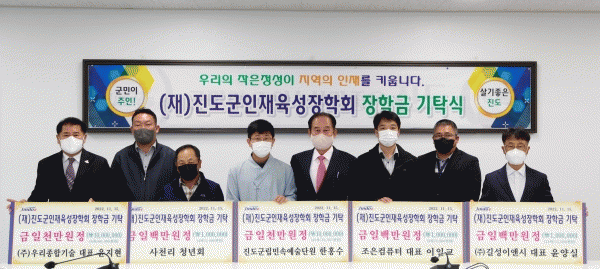 [¹Ìµð¾îÀü³² Á¦°¥´ëÁ¾ ±âÀÚ] Áö¿ª ÀÎÀç À°¼ºÀ» À§ÇØ Áøµµ±º¹ÎµéÀÌ ÀåÇÐ±Ý 3,900¸¸¿øÀ» ±âŹÇß´Ù. Áö³ 15ÀÏ ±ºÃ» »óȲ½Ç¿¡¼ ´ë½Å±â¾÷ ´ëÇ¥ Çϱ⼺ 1,500¸¸¿ø Áøµµ±º¸³¹Î¼Ó¿¹¼ú´Ü ´Ü¿ø ÇÑÈ«¼ö 1,000¸¸¿ø ¿ì¸®Á¾ÇÕ±â¼ú ´ëÇ¥ À±ÁöÇö 1,000¡¦