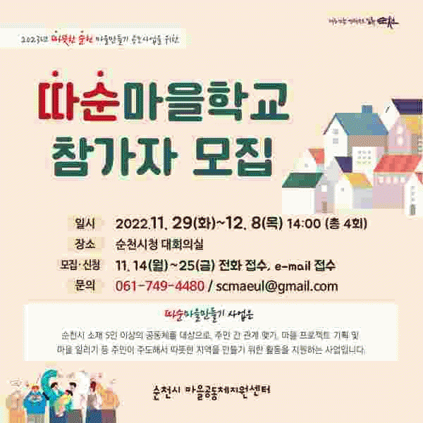 [¹Ìµð¾îÀü³² ÀÓ¼º¿Ï ±âÀÚ] ¼øÃµ½Ã´Â ¿À´Â 29ÀϺÎÅÍ 2023 µû¼ø¸¶À»¸¸µé±â °ø¸ð»ç¾÷¿¡ Âü¿©ÇÒ °øµ¿Ã¼¿Í °ü½É ÀÖ´Â ÁֹεéÀ» ´ë»óÀ¸·Î ¸¶À»°øµ¿Ã¼ ¿ª·® °È¸¦ À§ÇÑ µû¼ø¸¶À»Çб³ ±³À°À» °³¼³ÇÑ´Ù. ±³À° ÀÏÁ¤Àº 11¿ù 29ÀÏ 12¿ù 1ÀÏ 6ÀÏ 8ÀÏ¡¦