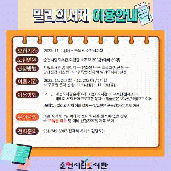 [¹Ìµð¾îÀü³² ÀÓ¼º¿Ï ±âÀÚ] ¼øÃµ½Ã´Â ´ÙÀ½ ´Þ 21ÀϺÎÅÍ 1°³¿ù°£ ¼øÃµ½Ã¸³µµ¼°ü ȸ¿øÁõ ¼ÒÁöÀÚ 200¸íÀ» ´ë»óÀ¸·Î ±¸µ¶Çü ÀüÀÚÃ¥ ¼ºñ½º ¡®¹Ð¸®ÀÇ ¼À硯¸¦ ½Ã¹ü ¿î¿µÇÑ´Ù°í ¹àÇû´Ù. ±¸µ¶Çü ÀüÀÚÃ¥Àº ÄÄÇ»Åͳª ¸ð¹ÙÀÏ·Î ¾ðÁ¦ ¾îµð¼³ª µ¶¼¡¦