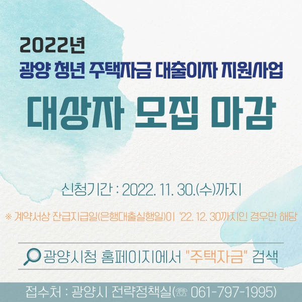 [¹Ìµð¾îÀü³² ÀÓ¼º¿Ï ±âÀÚ] ±¤¾ç½Ã´Â û³âÀÇ Áְźñ ºÎ´ã ¿Ïȸ¦ À§ÇØ ÃßÁø ÁßÀÎ ¡®±¤¾ç û³â ÁÖÅÃÀÚ±Ý ´ëÃâÀÌÀÚ Áö¿ø»ç¾÷¡¯ ½ÅûÀ» ¿À´Â 11¿ù 30ÀϱîÁö ¹Þ´Â´Ù. ¡®±¤¾ç û³â ÁÖÅÃÀÚ±Ý ´ëÃâÀÌÀÚ Áö¿ø»ç¾÷¡¯Àº 2018³âºÎÅÍ ±âÃÊ ÀÚÄ¡´Üü ¡¦