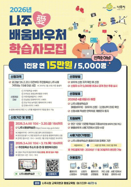 [¹Ìµð¾îÀü³² Á¦°¥´ëÁ¾ ±âÀÚ]Àü¶ó³²µµ ³ªÁֽ𡠽ùÎÀÇ Æò»ýÇнÀ±Ç º¸Àå°ú ÀÚ±â°è¹ß Áö¿øÀ» À§ÇØ 5õ ¸í ±Ô¸ðÀÇ ¡®2026³â ³ªÁÖ¾Ö(äñ)¹è¿ò¹Ù¿ì󡯸¦ º»°Ý ¿î¿µÇϸç ü°¨Çü Æò»ý±³À° Çõ½ÅÁ¤Ã¥À» À̾´Ù. ³ªÁֽô 19¼¼ ÀÌ»ó ½Ã¹ÎÀ» ´ë»ó¡¦