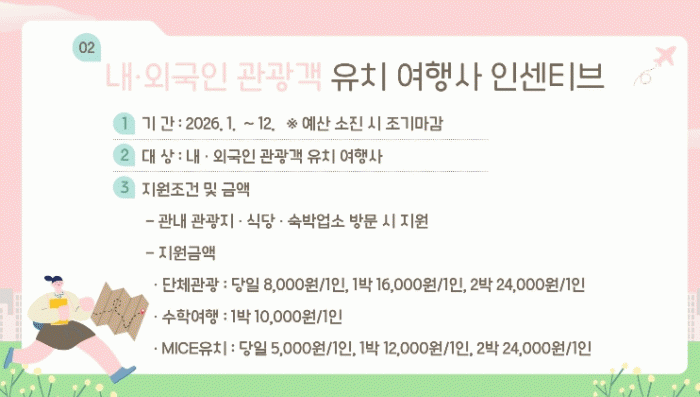[¹Ìµð¾îÀü³² ÀÓ¼º¿Ï ±âÀÚ]±¤¾ç½Ã´Â ´Üü °ü±¤°´ À¯Ä¡¸¦ ÅëÇØ ü·ùÇü °ü±¤À» È®´ëÇϰí Áö¿ª °ü±¤»ê¾÷ Ȱ¼ºÈ¸¦ µµ¸ðÇϱâ À§ÇØ 2026³â ³»¡¤¿Ü±¹ÀÎ °ü±¤°´ À¯Ä¡ ¿©Çà»ç Àμ¾Æ¼ºê Áö¿ø »ç¾÷À» ÃßÁøÇÑ´Ù. À̹ø Áö¿ø »ç¾÷Àº ±¤¾çÀ» ¹æ¹®ÇÏ´Â ´Ü¡¦