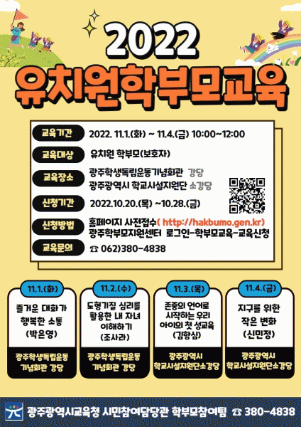 [¹Ìµð¾îÀü³² Á¦°¥´ëÁ¾ ±âÀÚ] ±¤Áֽñ³À°Ã»ÀÌ 11¿ù1~4ÀÏ ÃÑ 4ȸ¿¡ °ÉÃÄ À¯Ä¡¿ø ºÎ¸ð¸¦ ´ë»óÀ¸·Î ±¤ÁÖÇлýµ¶¸³¿îµ¿±â³äȸ°ü°ú ±¤ÁÖÇб³½Ã¼³Áö¿ø´Ü¿¡¼ À¯Ä¡¿ø Çкθð±³À°À» ¿î¿µÇÑ´Ù. 18ÀÏ ½Ã±³À°Ã»¿¡ µû¸£¸é À̹ø ±³À°Àº À¯Ä¡¿ø Àڳฦ µÐ¡¦