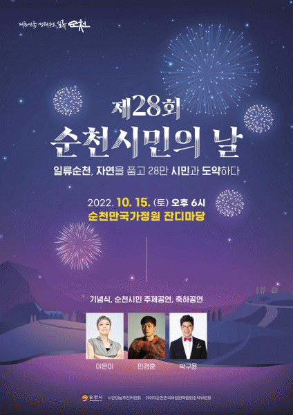 [¹Ìµð¾îÀü³² ÀÓ¼º¿Ï ±âÀÚ] ¼øÃµ½Ã(½ÃÀå ³ë°ü±Ô)°¡ ¿À´Â 15ÀÏ ¼øÃµ¸¸±¹°¡Á¤¿ø µ¿¹® Àܵ𸶴翡¼ Á¦28ȸ ¼øÃµ½Ã¹ÎÀÇ ³¯ ±â³äÇà»ç¸¦ °³ÃÖÇÑ´Ù. ¡®ÀÏ·ù½Ã¹Î, ÀÚ¿¬À» ǰ°í 28¸¸ ½Ã¹Î°ú µµ¾àÇÑ´Ù¡¯¸¦ ÁÖÁ¦·Î ½Ã¹Î°ú ÇÔ²²ÇÏ´Â ´Ùä·Î¿î Çà»ç°¡ ¡¦