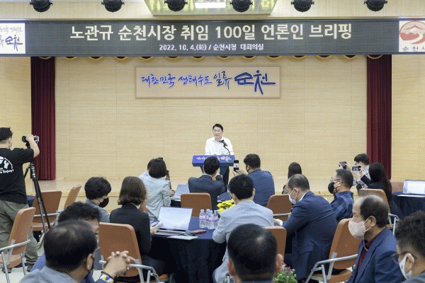 [¹Ìµð¾îÀü³² ÀÓ¼º¿Ï ±âÀÚ] ³ë°ü±Ô ¼øÃµ½ÃÀåÀº 4ÀÏ ÃëÀÓ 100ÀÏÀ» ¸ÂÀÌÇØ ¼øÃµ½Ãû ´ëȸÀǽǿ¡¼ ¾ð·ÐÀÎ ºê¸®ÇÎÀ» °®°í Áö³ 100ÀÏÀÇ ¼Òȸ¿Í ¾ÕÀ¸·ÎÀÇ ½ÃÁ¤ ¿î¿µ ¹æÇâ¿¡ ´ëÇÑ Ã»»çÁøÀ» Á¦½ÃÇß´Ù. ³ë ½ÃÀåÀº À̳¯ ¸ðµÎ ¹ß¾ð¿¡¼ ¡°10³â ¸¸¡¦