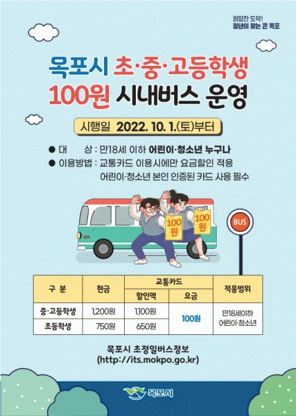 [¹Ìµð¾îÀü³² °í±Ô¼® ±âÀÚ] ¸ñÆ÷½Ã°¡ 10¿ù 1ÀÏ ºÎÅÍ ¡®ÃÊ¡¤Áß¡¤°íµîÇлý 100¿ø ½Ã³»¹ö½º¡¯¸¦ ½ÃÇàÇÑ´Ù. ¡®100¿ø ¹ö½º¡¯´Â ¹Î¼±8±â ¸ñÆ÷½Ã°¡ Ãâ¹ü ÀÌÈÄ Ã³À½À¸·Î ÀÌÇàÇÏ´Â °ø¾à À¸·Î ½Ã´Â ½Ã¹ÎÀÇ °æÁ¦Àû ºÎ´ãÀ» ¿ÏÈÇÏ°í ¾Æµ¿¡¤Ã»¼Ò³âÀÇ ±³¡¦