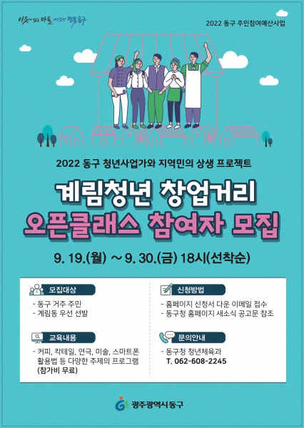 [¹Ìµð¾îÀü³² ±èÁ¤¿ì ±âÀÚ] ±¤ÁÖ µ¿±¸´Â û³â »ç¾÷°¡¿Í Áö¿ª¹ÎÀÇ »ó»ý ÇÁ·ÎÁ§Æ® ¡®°è¸² û³ââ¾÷°Å¸® ¿ÀÇÂŬ·¡½º¡¯ ÇÁ·Î±×·¥ Âü¿©ÀÚ¸¦ ¿À´Â 30ÀϱîÁö ¼±Âø¼øÀ¸·Î ¸ðÁýÇÑ´Ù°í ¹àÇû´Ù. ¡®°è¸² û³ââ¾÷°Å¸® ¿ÀÇÂŬ·¡½º¡¯´Â °è¸²µ¿ û³â »ç¾÷¡¦