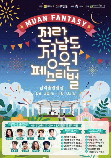 [¹Ìµð¾îÀü³² ±èÆÇ±¹ ±âÀÚ] °¡À»À» ¸Â¾Æ µµ½É¿¡¼ µ¿È ¼Ó Á¤¿øÀ» Áñ±æ ¼ö ÀÖ´Â Á¦2ȸ Àü¶ó³²µµ Á¤¿øÆä½ºÆ¼¹úÀÌ ÀÌ´Þ 30ÀϺÎÅÍ ³ªÈ굿¾È ³²¾Ç Áß¾Ó°ø¿ø¿¡¼ ÆîÃÄÁý´Ï´Ù. 23ÀÏ ¹«¾È±º¿¡ µû¸£¸é Á¤¿ø Æä½ºÆ¼¹úÀº Àü¶ó³²µµ¿Í ¹«¾È±ºÀÌ ÁÖÃÖÇÏ¡¦