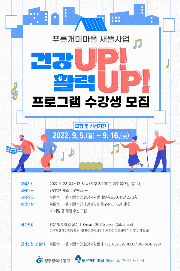 [¹Ìµð¾îÀü³² ±èÁ¤¿ì ±âÀÚ] ±¤ÁÖ µ¿±¸´Â Ǫ¸¥°³¹Ì¸¶À» »õ¶ã»ç¾÷ ÃßÁø°ú Áö¿ª Ư¼º¿¡ ¸Â´Â ÇÁ·Î±×·¥ ¿î¿µÀ» ÅëÇØ ÁֹΠ°£ Çù·ÂÀÇ ±âƲÀ» ´ÙÁö°íÀÚ ¡®°Ç°UP Ȱ·ÂUP ÇÁ·Î±×·¥¡¯ Âü°¡ÀÚ¸¦ ¿À´Â 16ÀϱîÁö ¼±Âø¼ø ¸ðÁýÇÑ´Ù°í ¹àÇû´Ù. ¡®°Ç°U¡¦