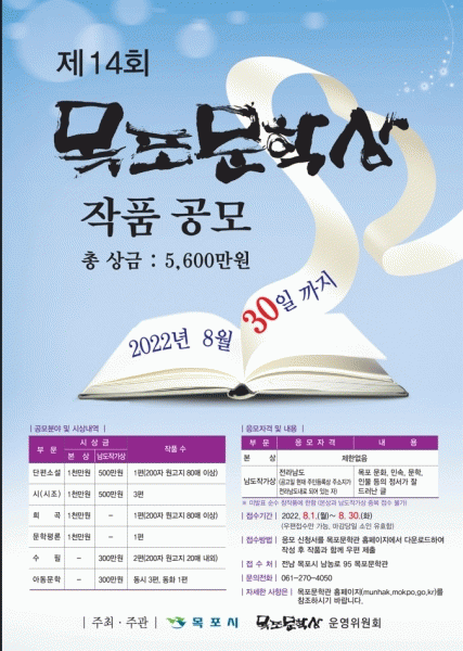 [¹Ìµð¾îÀü³² °í±Ô¼® ±âÀÚ] Á¦14ȸ '¸ñÆ÷¹®Çлó'ÀÇ ÀÛǰ Á¢¼ö°¡ »óȲ¸®¿¡ ¸¶°¨µÇ¸ç ¿ì¸®³ª¶ó ¹®Çа踦 ´ëÇ¥ÇÏ´Â °ø¸ðÀüÀ¸·Î ¶°¿À¸£°í ÀÖ´Ù. 'Á¦14ȸ ¸ñÆ÷¹®Çлó'Àº °ø¸ð¸¦ ÅëÇØ ÀÛǰÀ» Á¢¼öÇß°í ¸¶°¨ °á°ú ´ÜÆí¼Ò¼³, ½Ã, Èñ°î, ¹®ÇÐÆò·Ð,¡¦