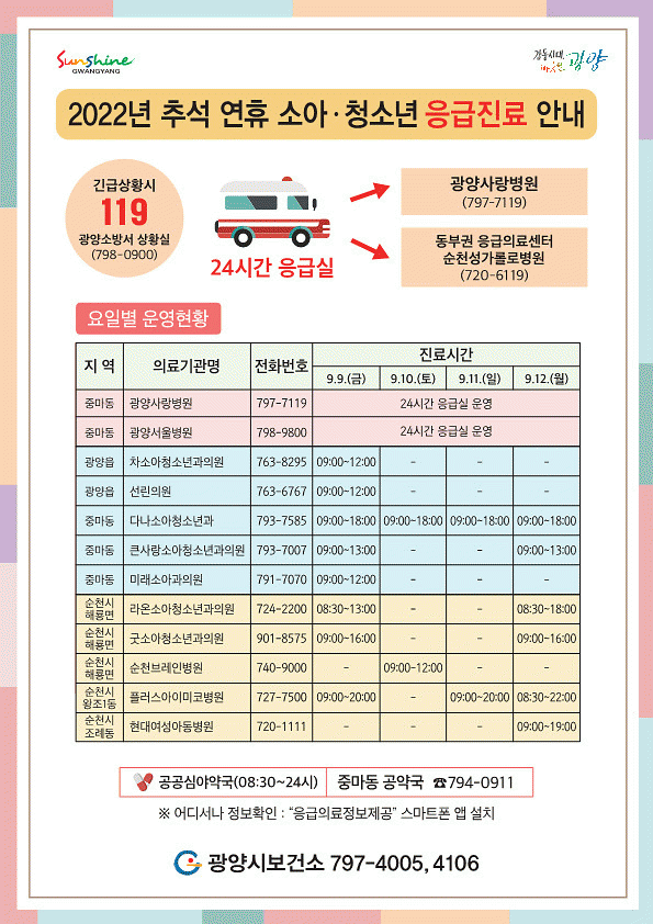 [¹Ìµð¾îÀü³² ÀÓ¼º¿Ï ±âÀÚ] ±¤¾ç½Ã´Â Ãß¼® ¿¬ÈޱⰣ ȯÀÚ Áø·á °ø¹é°ú Áö¿ª Äڷγª19 È®»ê ¹æÁö¸¦ À§ÇØ ¿À´Â 9~12ÀÏ ¼Ò¾Æ¡¤Ã»¼Ò³â ¹× ÀÀ±ÞȯÀÚ¿¡ ´ëÇÑ Áø·á´ëÃ¥À» ÃßÁøÇÑ´Ù. ½Ã´Â º¸°Ç¼Ò »óȲ½ÇÀ» ¿î¿µÇϰí ÀÇ·á±â°ü »óȲ ¸ð´ÏÅ͸µ, ¹®À»¡¦