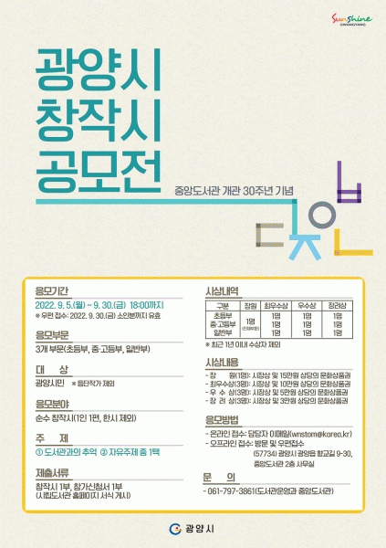 [¹Ìµð¾îÀü³² ÀÓ¼º¿Ï ±âÀÚ] ±¤¾ç½Ã°¡ ±¤¾çÁß¾Óµµ¼°ü ÁÖ°üÀ¸·Î 2022 âÀ۽à °ø¸ðÀüÀ» °³ÃÖÇÑ´Ù. 9¿ù µ¶¼ÀÇ ´ÞÀ» ¸Â¾Æ ÁøÇàµÇ´Â âÀ۽à °ø¸ðÀüÀº ¿À´Â 5~30ÀÏ ÃʵîºÎ¿Í Áß¡¤°íµîºÎ, ÀϹݺΠ¼¼ ºÎ¹®À¸·Î ³ª´² ¿î¿µÇÑ´Ù. µî´ÜÇÑ ÀÛ°¡¸¦ Á¦¡¦
