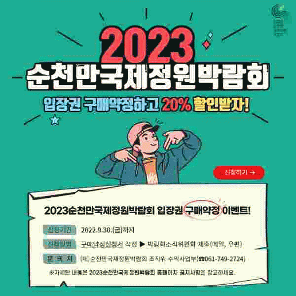 [¹Ìµð¾îÀü³² ÀÓ¼º¿Ï ±âÀÚ] ¼øÃµ¸¸±¹Á¦Á¤¿ø¹Ú¶÷ȸÁ¶Á÷À§¿øÈ¸´Â¡®2023¼øÃµ¸¸±¹Á¦Á¤¿ø¹Ú¶÷ȸ¡¯°³ÃÖ¸¦ ¾ÕµÎ°í ¿À´Â 30ÀϱîÁö ÀÔÀå±Ç ±¸¸Å¾àÁ¤ ÇÒÀÎÀ» ½Ç½ÃÇÑ´Ù. 2023¼øÃµ¸¸±¹Á¦Á¤¿ø¹Ú¶÷ȸ ÀÔÀå±Ç °¡°ÝÀº ÀÏ¹Ý º¸Åë±ÇÀº ¼ºÀÎ 1¸¸ 5õ¿ø, û¼Ò¡¦