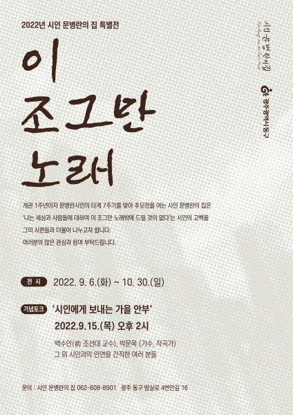[¹Ìµð¾îÀü³² ±èÁ¤¿ì ±âÀÚ] ±¤ÁÖ µ¿±¸´Â ½ÃÀÎ ¡®¹®º´¶õÀÇ Áý¡¯ °³°ü 1ÁÖ³âÀÌÀÚ ¹®º´¶õ ½ÃÀΠŸ°è 7Áֱ⸦ ±â³äÇØ Ưº°Àü ¡®ÀÌ Á¶±×¸¸ ³ë·¡¡¯¸¦ ¿À´Â 6ÀϺÎÅÍ 10¿ù 30ÀϱîÁö °³ÃÖÇÑ´Ù°í ¹àÇû´Ù. À̹ø Ưº°ÀüÀº ¡®³ª´Â ¼¼»ó°ú »ç¶÷µé¿¡ ´ëÇØ¡¦