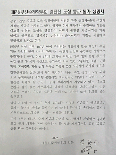 [¹Ìµð¾îÀü³² ÀÓ¼º¿Ï ±âÀÚ] Àç°æ¡¤ºÎ»ê¼øÃµÇâ¿ìȸ´Â 1ÀÏ ¡®°æÀü¼± ÀüÃ¶È ±¤ÁÖ~¼øÃµ ±¸°£ µµ½É Åë°ú ºÒ°¡¡¯¼º¸í¼¸¦ ¹ßÇ¥Çß´Ù. Çâ¿ìȸ´Â ¡°1930³â °Ç¼³ ÀÌÈÄ 100³â ¸¸¿¡ ÃßÁøÇÏ´Â »ç¾÷À¸·Î ¸¹Àº ¿¹»êÀÌ ÅõÀԵǴ »ç¾÷ÀÓ¿¡µµ, ¼øÃµ½Ã¹ÎÀÇ ¡¦