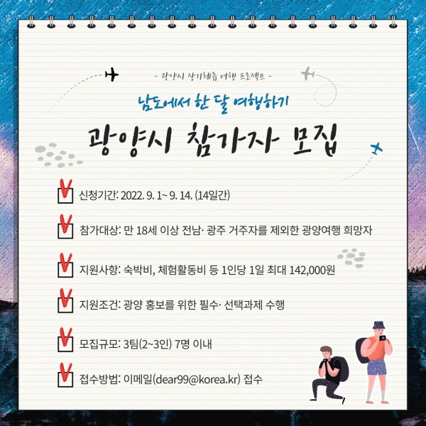 [¹Ìµð¾îÀü³² ÀÓ¼º¿Ï ±âÀÚ] ±¤¾ç½Ã°¡ Àü¶ó³²µµ Àå±âü·ù ¿©Çà ÇÁ·ÎÁ§Æ® ¡®³²µµ¿¡¼ ÇÑ ´Þ ¿©ÇàÇϱ⡯ ±¤¾ç¿©Çà Âü°¡ÀÚ¸¦ 9¿ù 1ÀϺÎÅÍ 14Àϰ£ ¸ðÁýÇÑ´Ù. Âü°¡´ë»óÀº Àü³²¡¤±¤ÁÖ ¿Ü¿¡ °ÅÁÖÇÏ´Â ¸¸ 18¼¼ ÀÌ»óÀ¸·Î 3°³ ÆÀ, 7¸í À̳»·Î ¸ðÁýÇÑ¡¦