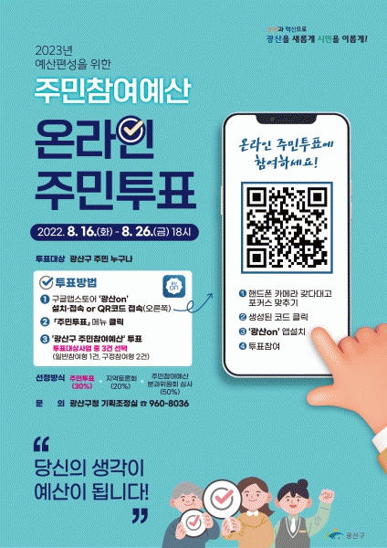 [¹Ìµð¾îÀü³² ±èÁ¤¿ì ±âÀÚ] ±¤ÁÖ ±¤»ê±¸´Â 2023³â ÁÖ¹ÎÂü¿©¿¹»ê»ç¾÷ ¼±Á¤À» À§ÇÑ ¡®¿Â¶óÀÎ ÁÖ¹ÎÅõÇ¥¡¯¸¦ ½Ç½ÃÇÑ´Ù°í 16ÀÏ ¹àÇû´Ù. ¡®ÁÖ¹ÎÂü¿©¿¹»ê¡¯Àº Áö¿ª ÁֹεéÀÌ Á÷Á¢ »ç¾÷À» Á¦¾ÈÇÏ°í ¿¹»êÆí¼º¿¡ Âü¿©ÇÏ´Â Á¦µµ´Ù. ±¤»ê±¸ÀÇ ¿ÃÇØ ¡¦