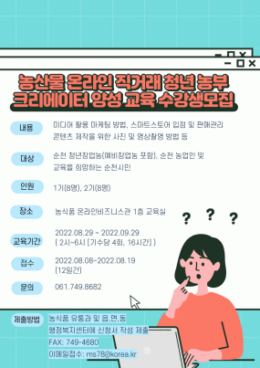 [¹Ìµð¾îÀü³² ÀÓ¼º¿Ï ±âÀÚ] ¼øÃµ½Ã´Â 8¿ù 19ÀϱîÁö ¡®Ã»³â ³óºÎ Å©¸®¿¡ÀÌÅÍ ¾ç¼º ±³À°¡¯ÀÇ ¼ö°»ýÀ» ¸ðÁýÇÑ´Ù. ¸ðÁý ÀοøÀº 1±â 8¸í, 2±â 8¸íÀ¸·Î ÃÑ 16¸íÀÌ¸ç °ü³» û³ââ¾÷³ó°ú ³ó¾÷ÀÎ, ±³À°À» Èñ¸ÁÇÏ´Â ¼øÃµ½Ã¹ÎÀÌ¸é ´©±¸³ª ½ÅûÇÒ ¼ö¡¦