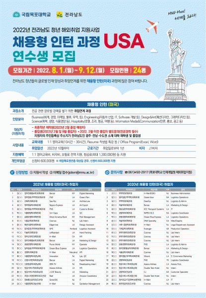 [¹Ìµð¾îÀü³² Á¦°¥´ëÁ¾ ±âÀÚ] Àü¶ó³²µµ°¡ û³âÀ» ´ë»óÀ¸·Î ¹Ì±¹ ÇöÁö Ãë¾÷ ÀÎÅÏ½Ê Âü°¡ÀÚ ¸ðÁý¿¡ µé¾î°¬´Ù. Àü³²µµ´Â 9¿ù 12ÀϱîÁö ¡®2022³â û³â ÇØ¿ÜÃë¾÷ Áö¿ø»ç¾÷¡¯ Âü°¡ÀÚ 24¸íÀ» ¸ðÁýÇÒ °èȹÀ̶ó°í ÀüÇß´Ù. Àü³²¿¡ ÁÖ¼Ò¸¦ µÐ ¸¸ 3¡¦