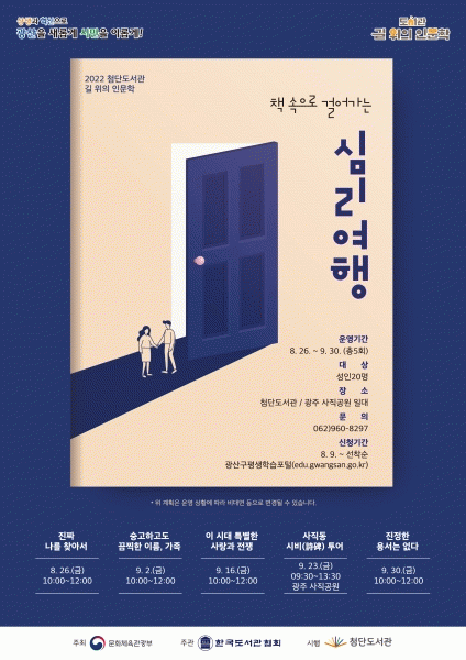 [¹Ìµð¾îÀü³² ±èÁ¤¿ì ±âÀÚ] ±¤ÁÖ ±¤»ê±¸ ÷´Üµµ¼°üÀÌ ¡®Ã¥ ¼ÓÀ¸·Î °É¾î°¡´Â ½É¸®¿©Ç࡯ ÁÖÁ¦·Î ÇÑ ¡®2022 µµ¼°ü ±æ À§ÀÇ Àι®ÇС¯ ÇÁ·Î±×·¥ÀÇ Âü¿©ÀÚ¸¦ ¸ðÁýÇÑ´Ù. ¡®µµ¼°ü ±æ À§ÀÇ Àι®ÇС¯Àº ¹®ÈüÀ°°ü±¤ºÎ°¡ ÁÖÃÖÇϰí Çѱ¹µµ¼°üÇù¡¦