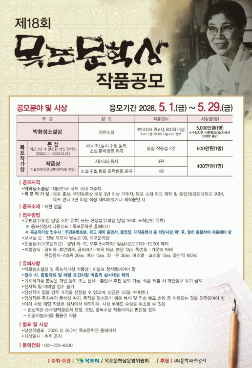 [¹Ìµð¾îÀü³² °í±Ô¼® ±âÀÚ]¸ñÆ÷½Ã´Â Çѱ¹ ±Ù´ë¹®ÇÐÀÇ »ê½ÇÀÎ ¸ñÆ÷ÀÇ ¹®ÇÐÀû ÀüÅëÀ» °è½ÂÇÏ°í ¿ª·® ÀÖ´Â ÀÛ°¡¸¦ ¹ß±¼Çϱâ À§ÇØ ¡®Á¦18ȸ ¸ñÆ÷¹®ÇÐ»ó¡¯ ÀÛǰÀ» °ø¸ðÇÑ´Ù°í ¹àÇû´Ù. ¿ÃÇØ·Î 18ȸ°¸¦ ¸ÂÀº ¸ñÆ÷¹®ÇлóÀº ±è¿ìÁø, ¹Úȼº, Â÷¹ü¡¦