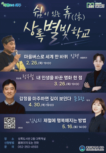 [¹Ìµð¾îÀü³² Á¦°¥´ëÁ¾ ±âÀÚ]±¤ÁÖ±¤¿ª½Ã ¼±¸´Â Áö¿ª Áֹο¡°Ô »çÀ¯¿Í À§·ÎÀÇ ½Ã°£À» Á¦°øÇϱâ À§ÇØ Àι®ÇÐ ÇÁ·Î±×·¥ ¡®»ó·Ïº°ºûÇб³¡¯¸¦ ¿î¿µÇÑ´Ù. À̹ø ÇÁ·Î±×·¥Àº 5¿ù±îÁö ÃÑ 4ȸ¿¡ °ÉÃÄ ÁøÇàµÇ¸ç ¿©Çࡤ¿¹¼ú¡¤½É¸®ÇÐ µî ´Ù¾çÇÑ ÁÖÁ¦·Î¡¦