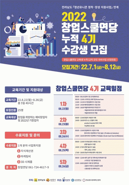 [¹Ìµð¾îÀü³² ÀÓ¼º¿Ï ±âÀÚ] ¼øÃµ½Ã´Â ¿À´Â 8¿ù 12ÀϱîÁö ¿¹ºñâ¾÷ÀÚ ¹× 3³â ¹Ì¸¸ Ãʱââ¾÷ÀÚ¸¦ ´ë»óÀ¸·Î 2022 â¾÷½ºÄ𿬴ç 4±â ¼ö°»ý 25¸íÀ» ¸ðÁýÇÑ´Ù. ¡®Ã¢¾÷½ºÄ𿬴硯Àº ¼øÃµ½ÃÀÇ Ã¢¾÷º¸À°±â°üÀΠâ¾÷¿¬´ç¿¡¼ ¿¹ºñâ¾÷ÀÚ ¹× Ãʱâ⡦