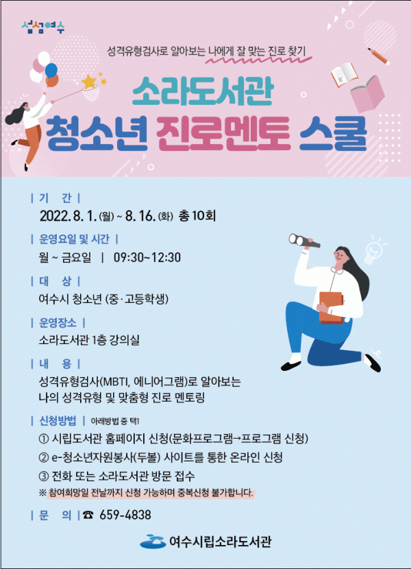 [¹Ìµð¾îÀü³² ÀüÇü¼º ±âÀÚ] ¿©¼ö½Ã¸³¼Ò¶óµµ¼°üÀÌ ¿©¸§¹æÇÐÀ» ¸Â¾Æ 8¿ù 1ÀϺÎÅÍ °ü³» Áß°íµîÇлýÀ» ´ë»óÀ¸·Î ¡®Ã»¼Ò³â Áø·Î¸àÅä ½ºÄð¡¯À» ¿î¿µÇÑ´Ù. ¡®Ã»¼Ò³â Áø·Î¸àÅä ½ºÄð¡¯Àº ¼º°Ý À¯Çü°Ë»ç·Î º»ÀÎÀÇ Àû¼ºÀ» ÆÄ¾ÇÇϰí Àü¹®°»çÀÇ »ó´ã¡¦