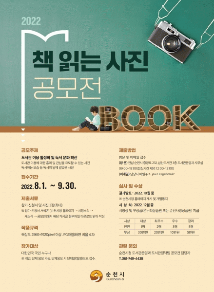 [¹Ìµð¾îÀü³² ÀÓ¼º¿Ï ±âÀÚ] ¼øÃµ½Ã´Â 9¿ù µ¶¼ÀÇ ´ÞÀ» ¸ÂÀÌÇØ µµ¼°ü ÀÌ¿ëÀ» Ȱ¼ºÈÇϰí Ã¥ Àд ¹®È¸¦ È®»êÇϱâ À§ÇØ ¡®Ã¥ Àд »çÁø¡¯À» °ø¸ðÇÑ´Ù. ÀÛǰÀº µµ¼°ü À̿뿡 ´ëÇÑ Èï¹Ì¿Í °ü½ÉÀ» À¯µµÇÒ ¼ö ÀÖ´Â »çÁøÀ̳ª µ¶¼ ÇÏ´Â ¸ð½ÀÀ»¡¦