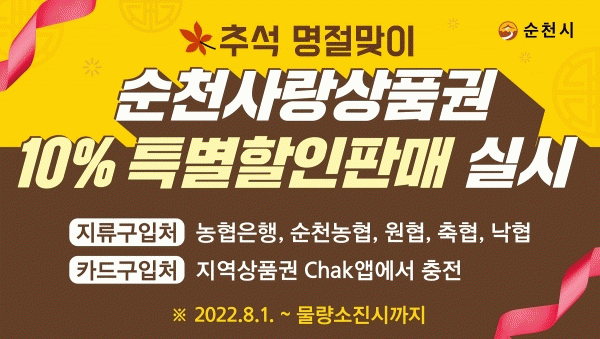 [¹Ìµð¾îÀü³² ÀÓ¼º¿Ï ±âÀÚ] ¼øÃµ½Ã´Â ´Ù°¡¿À´Â Ãß¼® ¸íÀýÀ» ¸Â¾Æ ¿À´Â 8¿ù 1ÀϺÎÅÍ ¼øÃµ»ç¶û»óǰ±Ç 10% Ưº°ÇÒÀÎÆÇ¸Å¸¦ ½Ç½ÃÇÑ´Ù. ½Ã´Â Àü³²µµ³» ÃÖ°í ±¹ºñ ¿¹»êÀÎ 5¾ï 2õ¸¸¿øÀ» Ãß°¡ È®º¸ÇÔ¿¡ µû¶ó ´çÃÊ °èȹ º¸´Ù 10% ÇÒÀÎÆÇ¸Å ±Ô¸ð¸¦¡¦