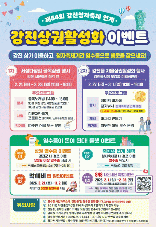 [¹Ìµð¾îÀü³² °í±Ô¼® ±âÀÚ]°Áø±ºÀÌ Á¦54ȸ °ÁøÃ»ÀÚÃàÁ¦ÀÇ ¿±â¸¦ À̾°í Áö¿ª »ó±Ç ÀÌ¿ëÀ» µ¶·ÁÇϱâ À§ÇØ, ¿À´Â 27ÀϺÎÅÍ 3¿ù 1ÀϱîÁö ¡®°ÁøÀ¾½ÃÀå ¿À°¨Åë »ó±ÇȰ¼ºÈ À̺¥Æ®¡¯¸¦ °³ÃÖÇÑ´Ù. À̹ø Çà»ç´Â Áß¼Òº¥Ã³±â¾÷ºÎ °ø¸ð»ç¾÷ÀΡ¦
