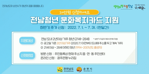 [¹Ìµð¾îÀü³² ÀÓ¼º¿Ï ±âÀÚ] ¼øÃµ½Ã°¡ 7¿ù ÇÑ´Þ°£ ¡®Àü³²Ã»³â ¹®Èº¹ÁöÄ«µå Áö¿ø»ç¾÷¡¯´ë»óÀÚ¸¦ Ãß°¡ ¸ðÁýÇÑ´Ù. Àü³²Ã»³â ¹®Èº¹ÁöÄ«µå Áö¿ø»ç¾÷Àº Áö¿ª ³» °ÅÁÖÇϴ û³âµé¿¡°Ô ¹®È»ýȰ ÇâÀ¯¿Í Àڱⰳ¹ßÀÇ ±âȸ¸¦ Á¦°øÇϱâ À§ÇØ 1ÀÎ´ç ¿¬¡¦