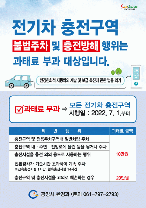 [¹Ìµð¾îÀü³² ÀÓ¼º¿Ï ±âÀÚ] ±¤¾ç½Ã´Â 7¿ù 1ÀϺÎÅÍ Áö¿ª ³» ¸ðµç °ø¿ë Àü±âÂ÷ ÃæÀü½Ã¼³ ³» ÃæÀü¹æÇØÇàÀ§¿¡ ´ëÇØ ÁֹνŰíÁ¦¸¦ ¿î¿ëÇÑ´Ù. ÁֹνŰíÁ¦´Â ¡®È¯°æÄ£ÈÀû ÀÚµ¿Â÷ÀÇ °³¹ß ¹× º¸±Þ ÃËÁø¿¡ °üÇÑ ¹ý·ü¡¯¿¡ ÀǰÅÇØ Àü±âÀÚµ¿Â÷ ÃæÀü½Ã¡¦