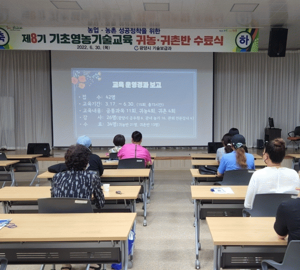 [¹Ìµð¾îÀü³² ÀÓ¼º¿Ï ±âÀÚ] ±¤¾ç½Ã´Â Áö³ 6¿ù 30ÀÏ ±¤¾ç½Ã ³ó¾÷Àα³À°°ü¿¡¼ ±Í³ó¡¤±ÍÃÌ¹Ý ±³À°»ý ¹× °ü°èÀÚ 40¸íÀÌ Âü¼®ÇÑ °¡¿îµ¥ ¡®Á¦8±â ±âÃÊ¿µ³ó±â¼ú±³À° ±Í³ó¡¤±ÍÃ̹ݡ¯ ¼ö·á½ÄÀ» °¡Á³´Ù. À̹ø °úÁ¤Àº Áö³ 3¿ù 17ÀÏ °³°ÇØ 6¿ù 30¡¦