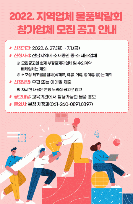 [¹Ìµð¾îÀü³² °í±Ô¼® ±âÀÚ] Àü¶ó³²µµ±³À°Ã»ÀÌ Áö¿ª Áß¼Ò¾÷ü¿Í »ó»ýÀ» À§ÇØ ¡®2022 Áö¿ª ¾÷ü ¹°Ç°¹Ú¶÷ȸ¡¯¸¦ °³ÃÖÇÑ´Ù. 22ÀÏ µµ±³À°Ã»¿¡ µû¸£¸é Àü³²µµ¿¡ ÁÖ¼Ò¸¦ µÎ°í ¿µ¾÷ÇàÀ§¸¦ Çϰí ÀÖ´Â Áß¡¤¼Ò Á¦Á¶¾÷ü¸¦ ´ë»óÀ¸·Î ¿À´Â 10¿ù 20¡¦
