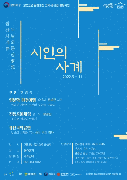 [¹Ìµð¾îÀü³² ±èÁ¤¿ì ±âÀÚ] ±¤ÁÖ ±¤»ê±¸°¡ ¹®ÅÂÁØ ½ÃÀΰú ÇÔ²²ÇÏ´Â Á¦2ȸ ¡®½ÃÀÎÀÇ »ç°è¡¯ ÇÁ·Î±×·¥ Âü¿©ÀÚ¸¦ ¸ðÁýÇÑ´Ù. À̹ø ÇÁ·Î±×·¥Àº 2022³â ¹®ÈÀçû °íÅá¤Á¾°«Áý Ȱ¿ë»ç¾÷ÀÇ ÀÏȯÀ¸·Î ±¤»ê±¸ ´ëÇ¥ °¡¿Á ¹®ÈÀçÀÎ ¿ë¾Æ»ý°¡¿¡¼ 7¡¦